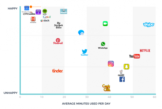 Календарь Google, Wunderlist (список дел) и Waze формирую область счастья. Пользователи проводят в них сравнительно мало времени, 3 минуты в день для Календаря или 15 минут в день для Waze. Из тех приложений, на которые люди тратят много времени, только Skype (почти 60 минут в день) и FaceTime (около 40) дают им удовлетворение. С другой стороны — Facebook, Reddit, Candy Crush, которые потребляют кучу времени, но счастья особого не дают.