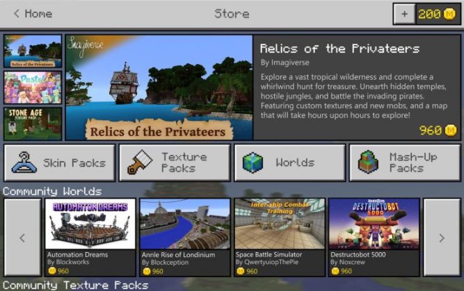Marketplace предложит карты, текстуры, скины, мини-игры и многое другое, все под надзором команды Minecraft. На старте в каталоге будут подборки товаров от некоторых создателей, выбранных модераторами, но в конечном итоге магазин откроют для всех пользователей — вы можете подать заявку на регистрацию здесь.