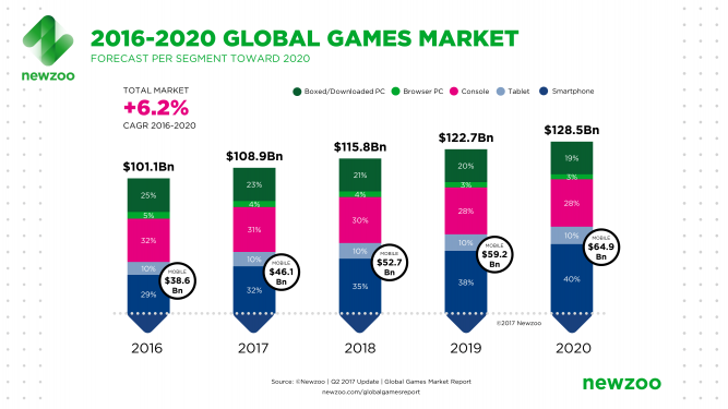 Newzoo выпустил новый квартальный отчет о мировом рынке игр. Прогноз компании на 2017 год — 2.2 миллиарда игроков и 108.9 миллиарда долларов дохода.