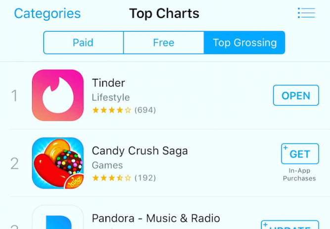 Tinder впервые вышел на первое место в Топе зарабатывающих