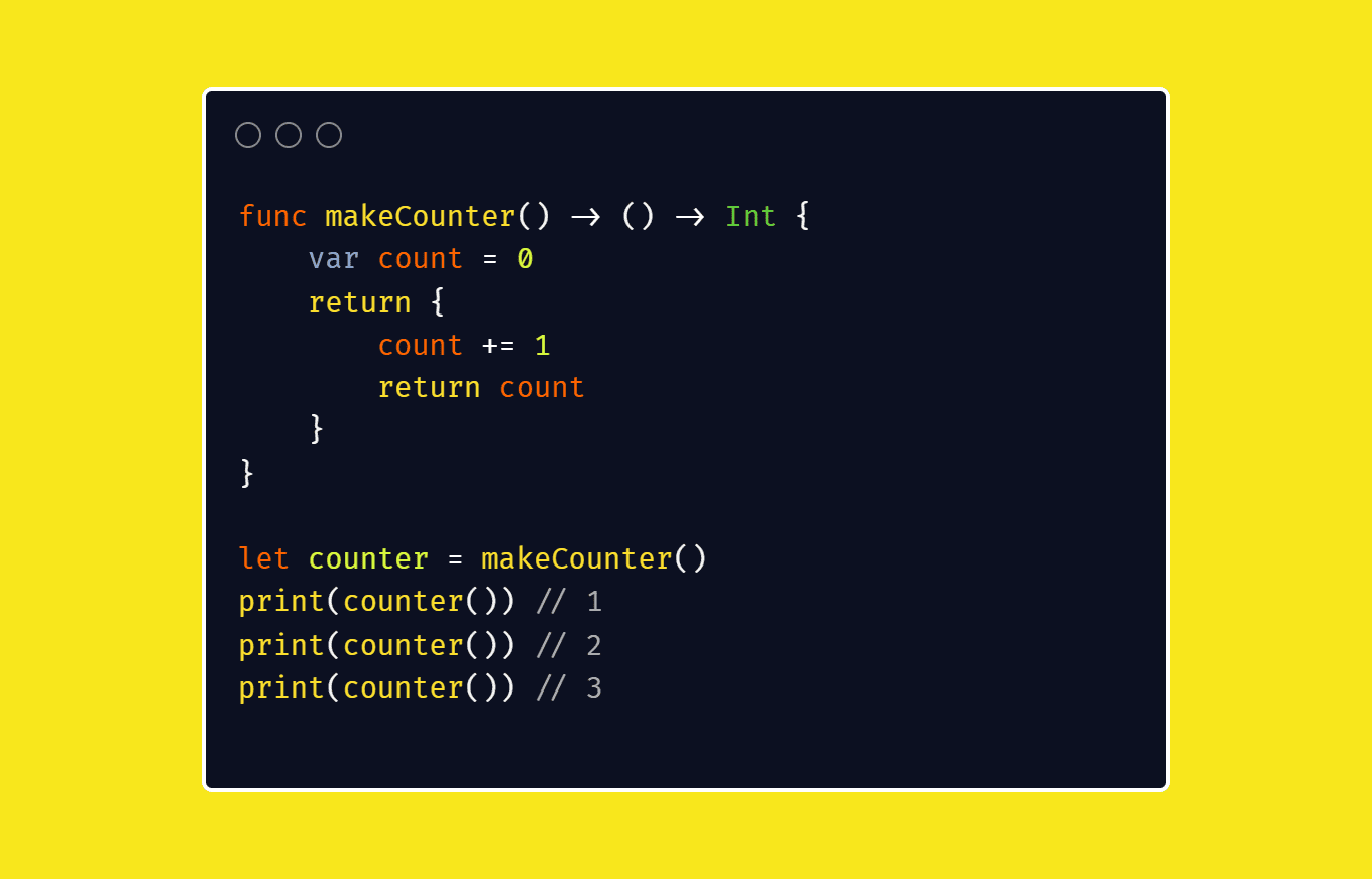 В этом примере поведение абсолютно аналогично Swift: переменная count, объявленная внутри функции makeCounter, остаётся доступной для замыкания, возвращённого этой функцией. Несмотря на то, что выполнение функции завершилось, лямбда продолжает использовать переменную, которая уже вроде как должна была исчезнуть. Это становится возможным благодаря механизму замыканий, при котором компилятор и рантайм сохраняют ссылку на переменные из внешнего контекста.