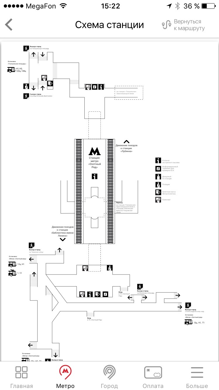 Есть расширенная информация о станции с фотографиями, расписанием работы, ближайшим наземным транспортом, переходами на другие станции, выходами к улицам, схемой и даже историей этой станции! Всё бы хорошо, но информация представлена в виде скучных списков. В лучшем случае приложение кинет вас на карту с огромным синим пином — если захотите увидеть, куда ведёт один из выходов или где находится остановка общественного транспорта. Схема станции – в виде чёрно-белого чертежа, никакого интерактива.