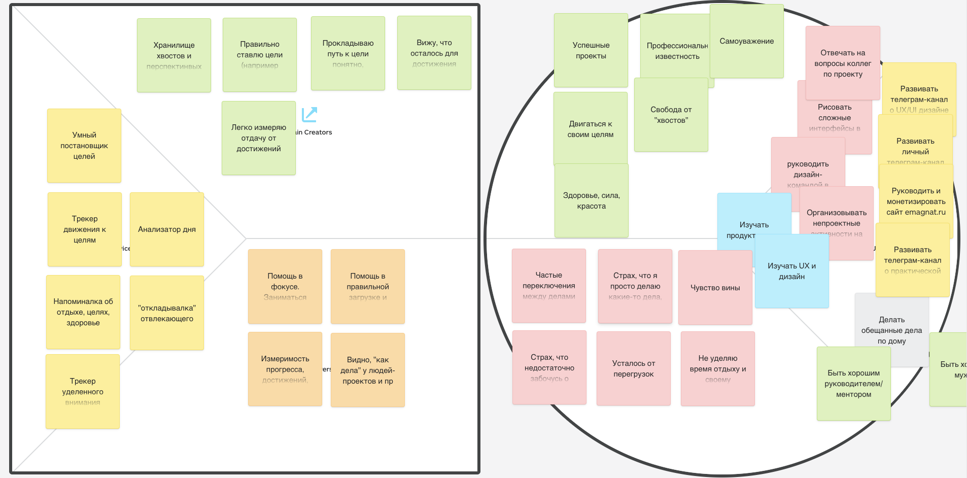 - но целей слишком много (боль) — нужна помощь в правильной загрузке и отдыхе. Брать на себя столько, сколько могу сделать, иметь выделенное на отдых и восстановление (реливер) — в этом поможет умный постановщик целей (кусок продукта);