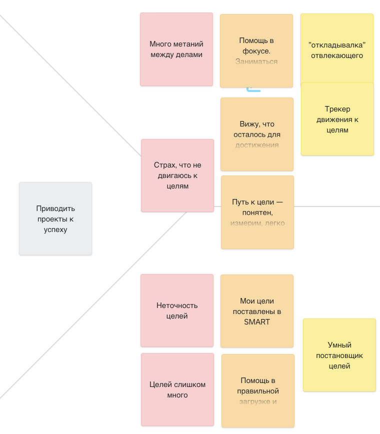 - но неточность целей (боль) — нужно, чтобы мои цели были поставлены в SMART — в этом поможет умный постановщик целей (кусок продукта);