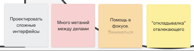 - но много метаний между делами (боль) — нужна помощь в фокусе. Заниматься долго одним делом, откладывая важное, но отвлекающее, на потом (реливер) — в этом поможет откладывалка отвлекающего (кусок продукта);