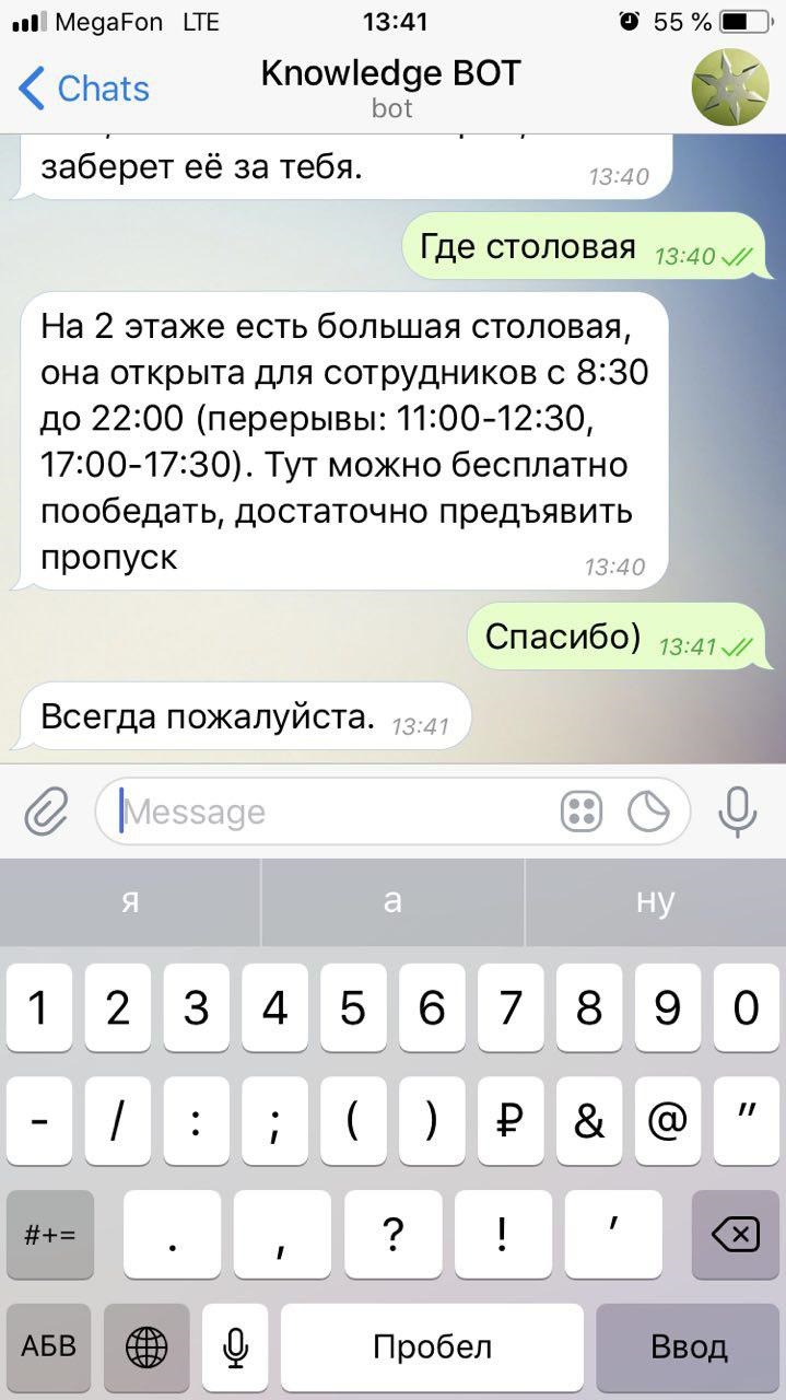 Если же отправить новому сотруднику ссылку на чат-бота вместе с оффером, он напомнит, как добраться до офиса личным или общественным транспортом, закажет пропуск на сотрудника и так далее. В случае непредвиденных проблем новичок может написать об этом боту, который оперативно передаст информацию в HR. Пришлет пароль для активации рабочего места и расскажет к кому обращаться по основным вопросам – ИТ-поддержка, канцелярка, парковки и т.д.