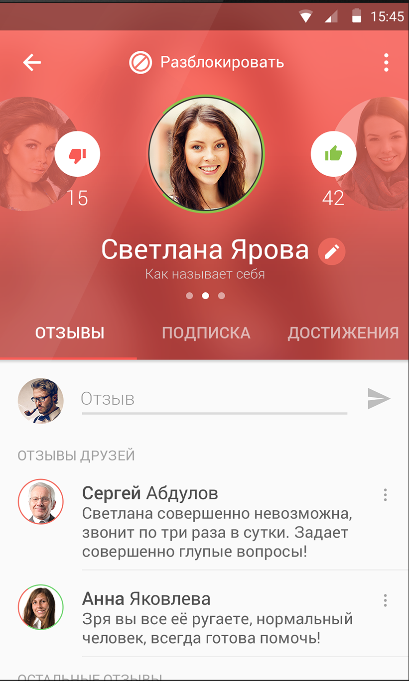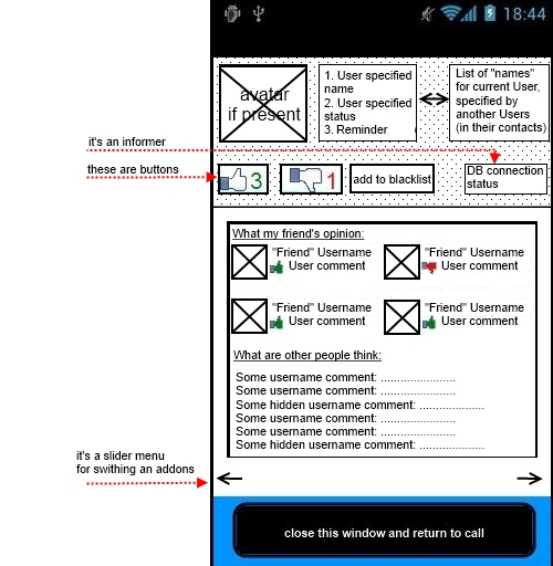 Так родилась идея создать элементарное приложение, которое объединяло бы знания о телефонных номерах всех наших знакомых и родственников. Где-то далеко, в облаке – росла библиотека знаний о телефонных номерах, с отзывами-пояснениями – что это за человек такой. Затем добавились оценки к номерам (позитивные и негативные) и возможность заблокировать тот или иной номер у себя на телефоне. Наше маленькое сообщество активно делилось сведениями с этой глобальной телефонной книжкой, мы все увлеченно писали отзывы, ставили оценки – а маленькая программка со страшненьким дизайном сообщала всё, что знала, о незнакомом входящем звонке или СМС. То есть, всё то, чему каждый из нас её научил.