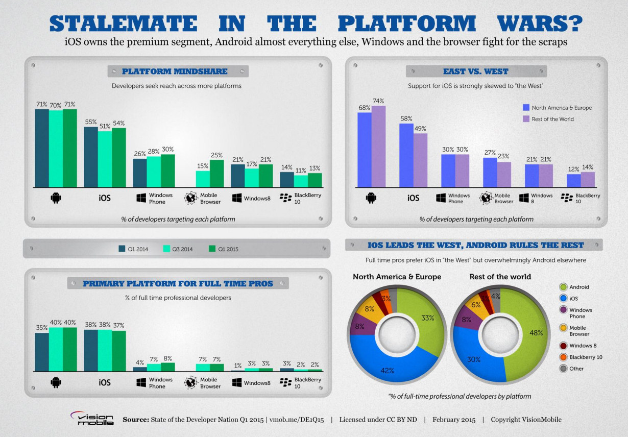 Разделение приоритетов у профессиональных разработчиков лучше всего иллюстрирует этот тупик. Android является приоритетной платформой у 40% разработчиков, iOS — у 37%, Windows Phone и мобильные браузеры — у 8 и 7% соответственно.