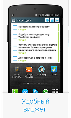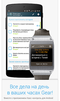 Хаос-контроль для Tizen состоит из двух составляющих: Android-приложения в качестве основного клиента и виджета для Tizen, являющегося, по сути, интерфейсом на часах к данным приложения в телефоне. Проектированием, формированием требований и разработкой Android-приложения занималась наша команда, а с виджетом для часов нам помогли ребята из Touch Instinct, за что им большое спасибо.
