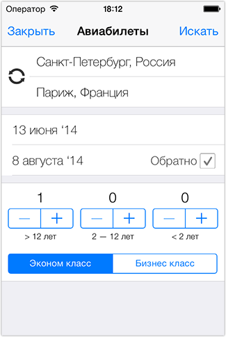 Партнерский API существует у нас уже давно. Но вряд ли кто-то возьмется разрабатывать iOS приложение, имея в распоряжении только API. Все-таки трудозатраты на такое приложение слишком велики. Поэтому мы решили не ждать, когда нас об этом попросят, а сделать такой инструмент, с помощью которого можно было бы легко внедрить поисковую форму в существующие приложения, либо создать приложение по поиску авиабилетов с нуля.