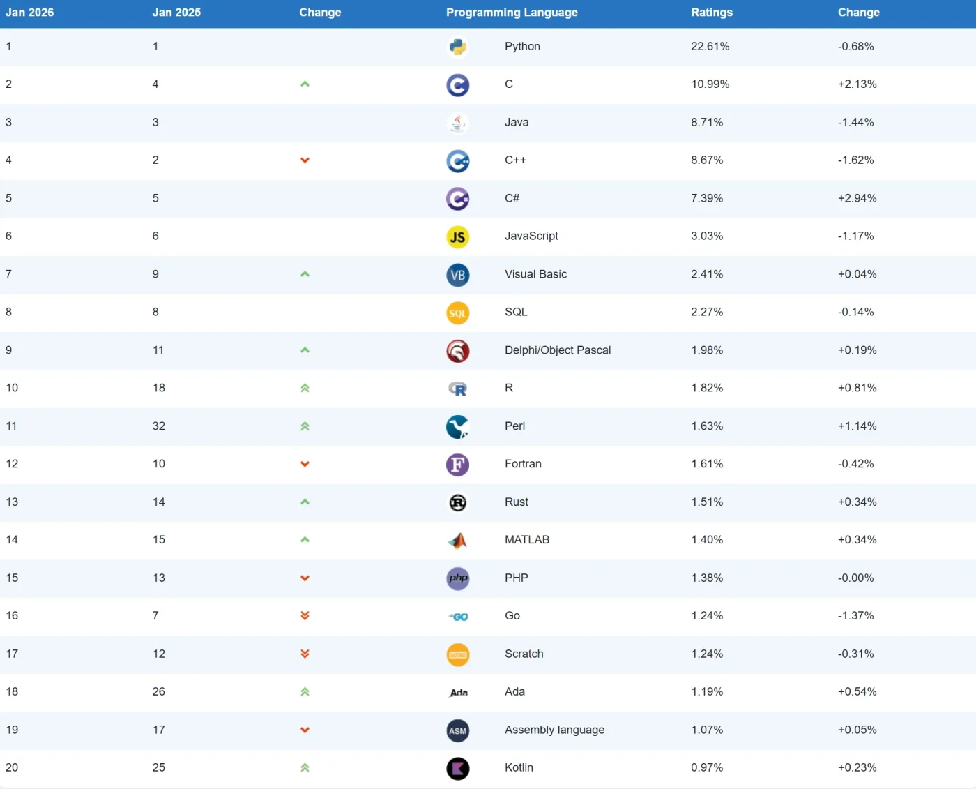 Так кто же, помимо C#, стал победителем 2025 года? Perl совершил неожиданное возвращение, поднявшись с 32-й позиции на 11-ю и вновь войдя в топ-20. Еще один язык, вернувшийся в топ-10, — это R, во многом благодаря продолжающемуся росту в области анализа данных и статистических вычислений. Kotlin прибавил 5 позиций и вошел по итогам года в двадцатку. Swift сейчас находится на 22 месте, Dart на 26 и Objective-C на 29.