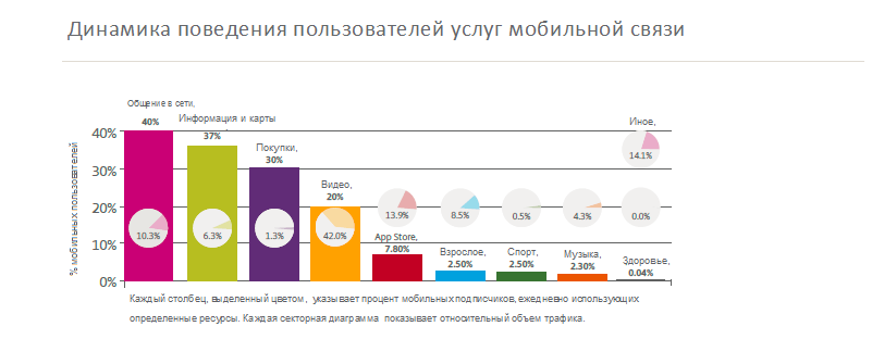 Общение в социальных сетях – это самое популярное занятие среди пользователей услуг мобильной связи, 40% абонентов мобильных операторов ежедневно посещают подобного рода ресурсы. Согласно отчету, 47% трафика в социальных сетях приходятся на видео, а 40% – на изображения. Если говорить о конкретных регионах, подписчики услуг в Северной Америке и на Ближнем Востоке демонстрируют самые высокие показатели «потребления» видео в социальных сетях. Объем трафика видео составляет 59% и 62% от всего объема, соответственно. Тогда как в Европе на видео приходится всего 39% трафика, а в Азиатско-Тихоокеанском регионе эта цифра составляет 35%.