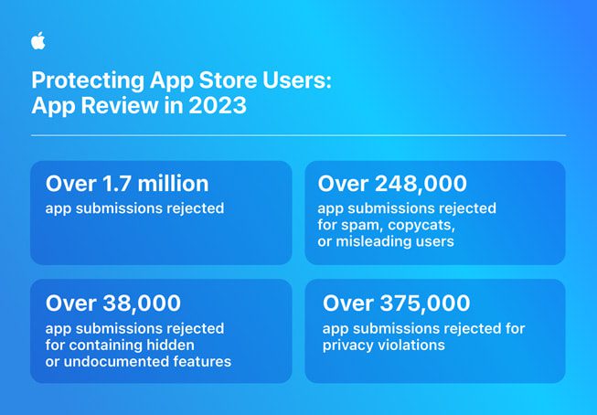 В опубликованном сегодня четвертом ежегодном отчете о предотвращении мошенничества компания Apple рассказала, что в 2023 году она отклонила более 1.7 миллиона приложений за несоответствие строгим стандартам App Store в отношении конфиденциальности, безопасности и контента. Кроме того, усилия Apple по пресечению и сокращению мошенничества в App Store привели к прекращению работы почти 374 миллионов учетных записей разработчиков и клиентов, а также к удалению около 152 миллионов оценок и отзывов из-за опасений мошенничества.