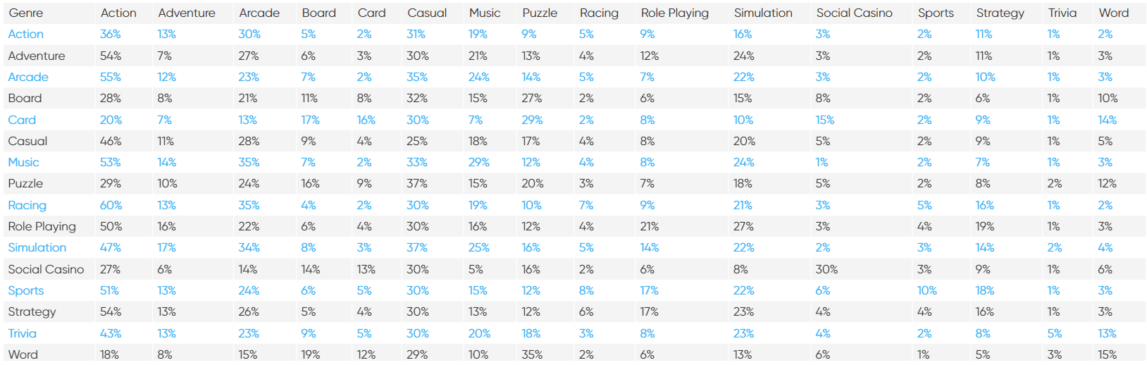По строкам: цифры говорят нам, какова доля пользователей, которые играют в жанр x, а также играют в жанры y, жанр z и т.д. Например, мы можем видеть, что 26% игроков в Puzzle также играют в экшн-игры, а 38% также играют в казуальные игры.