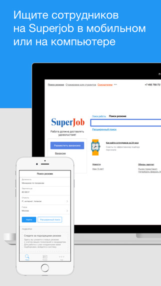 Компания Superjob представила первое в России мобильное приложение для поиска сотрудников. Проводить быстрый поиск среди 15 миллионов резюме, открывать контакты и приглашать на собеседования работодатели теперь смогут на экране смартфона или планшета.