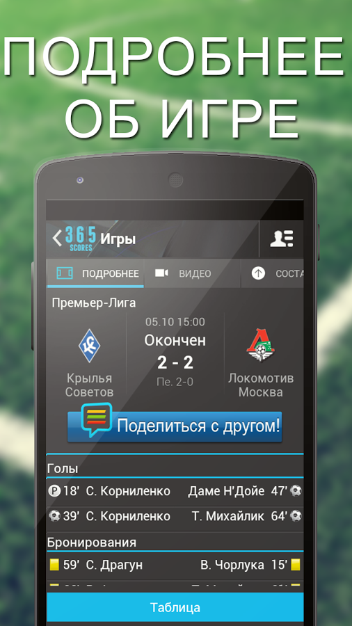 Информационный контент приложения 365Sсores самый широкий: результаты игр, статистика, прогнозы, видео, комментарии экспертов, лента новостей спортивных сайтов, слухи, твиттер-сообщения и посты из блогов игроков. Пользователи могут включить гибкую настройку фильтров и смотреть только то, что им интересно, отправлять мгновенные push-уведомления о ходе игр в реальном времени (гол, красная и желтая карточка, подачи в теннисе и другое) своему списку контактов.