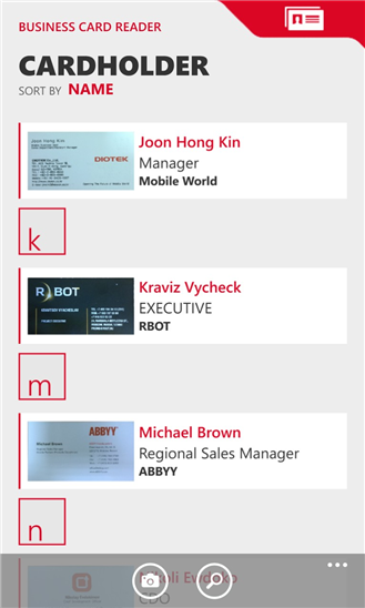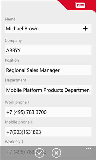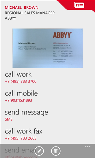 Компания ABBYY выпустила версию популярного приложения ABBYY Business Card Reader для платформы Windows Phone. Приложение автоматически переносит информацию со снимков визитных карточек на мобильное устройство и обеспечивает раздельное хранение деловых и личных контактов.
