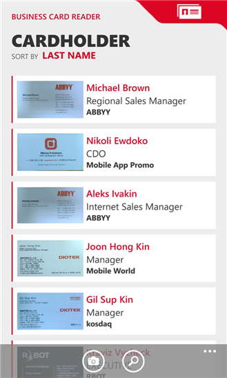 Благодаря ABBYY Mobile OCR Engine, технологии ABBYY для оптического распознавания текста на мобильных устройствах, Business Card Reader для Windows Phone обеспечивает превосходное качество «считывания» данных с бумажных визиток на 21 языке.