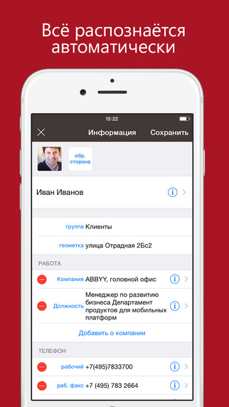Благодаря технологии ABBYY Mobile Imaging SDK в новой версии Business Card Reader для iOS: