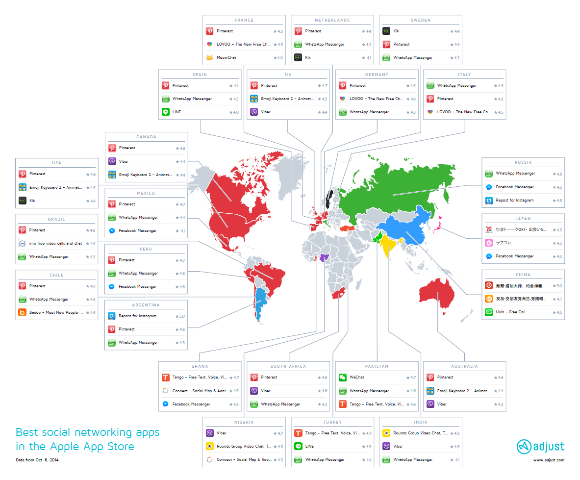 Компания Adjust исследовала социальные мобильные приложения в App Store и Google Play и составила рейтинг популярности. Всего компания проанализировала 217,549 приложений в разделе «Социальные сети» в 155 странах. Учитывались позиции приложений в рейтинге и оценки пользователей.