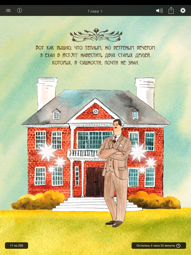 Если говорить о мультимедиа в классическом понимании, кроме анимационных элементов, с которыми можно взаимодействовать, в приложении есть музыкальный фон. Мы писали треки таким образом, чтобы они не отвлекали пользователя от чтения, но при этом создавали соответствующую книге атмосферу. Если читателю не нравится фон или кажется ему отвлекающим, его всегда можно отключить.