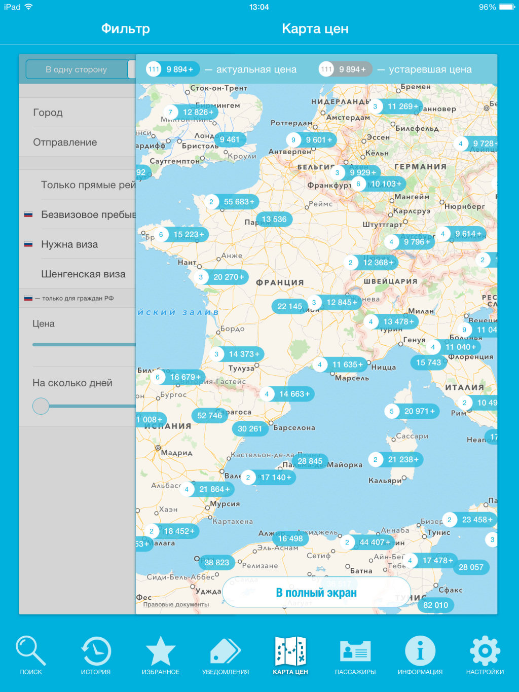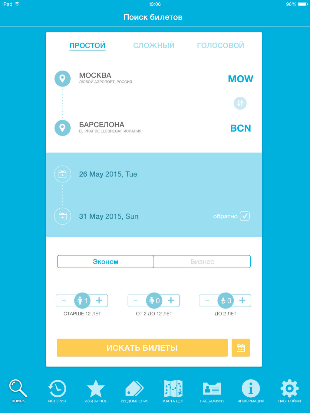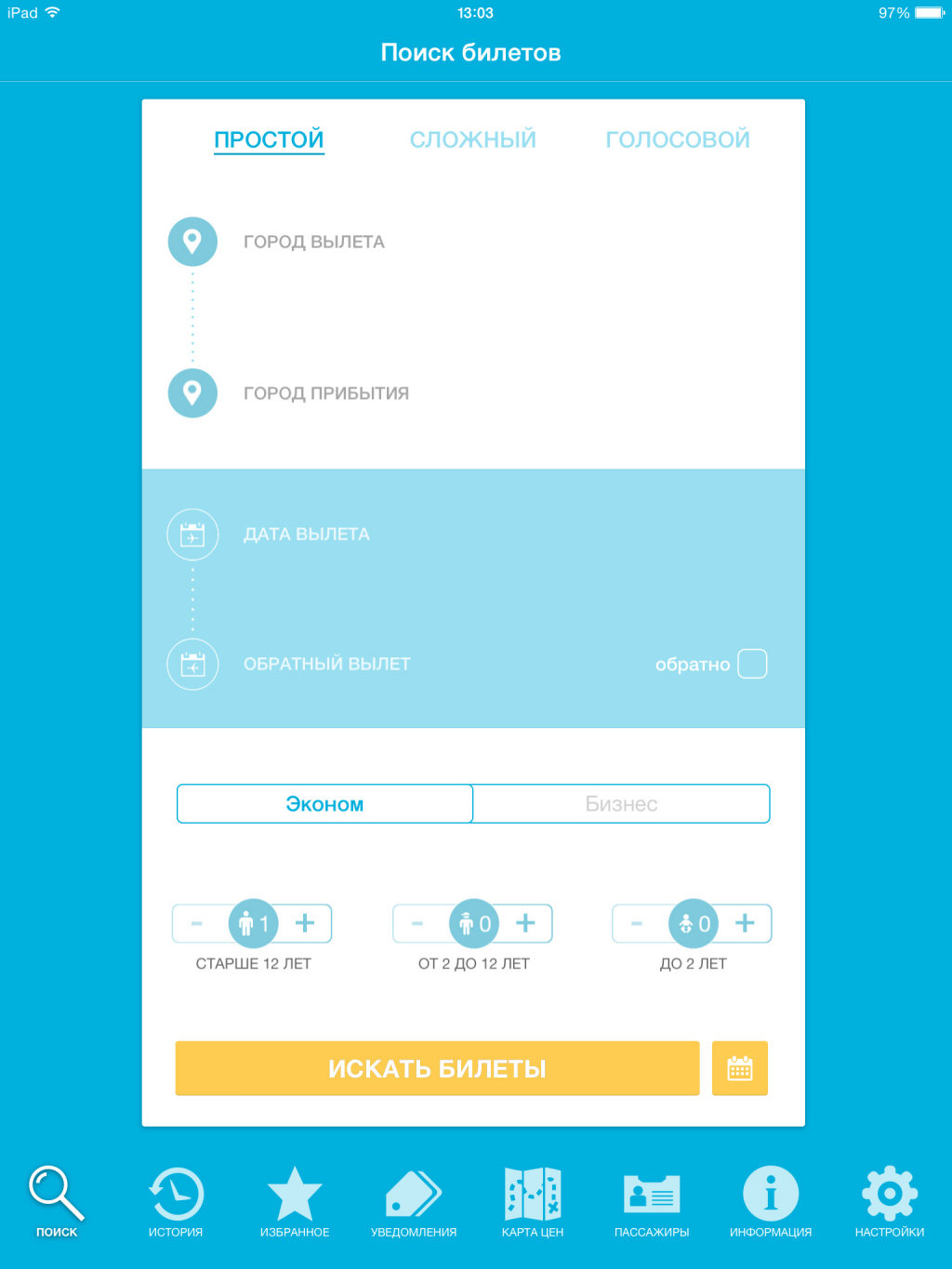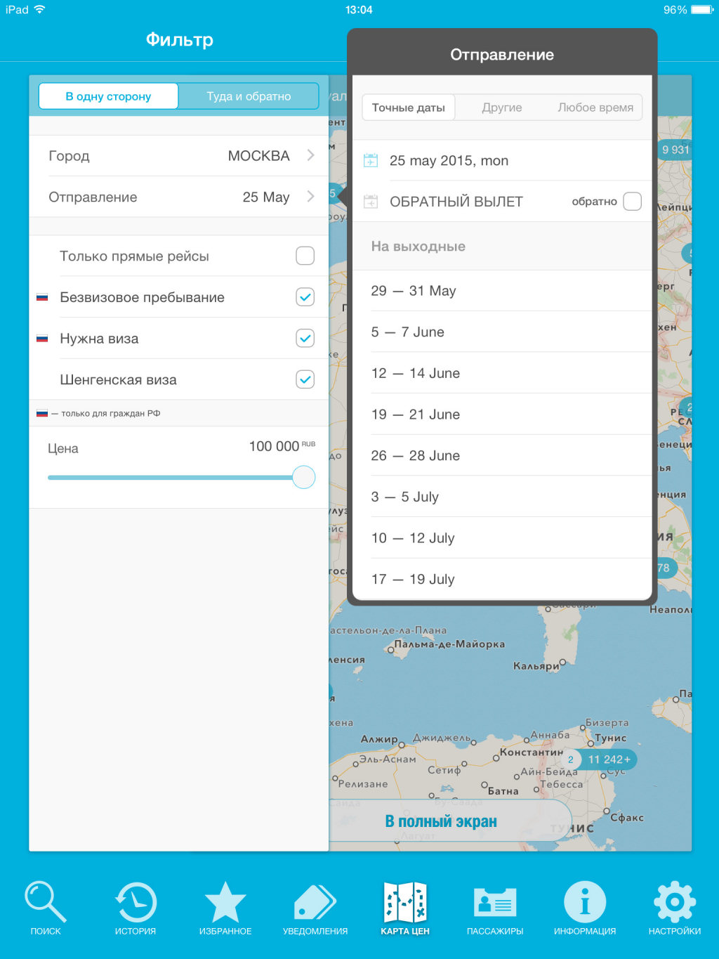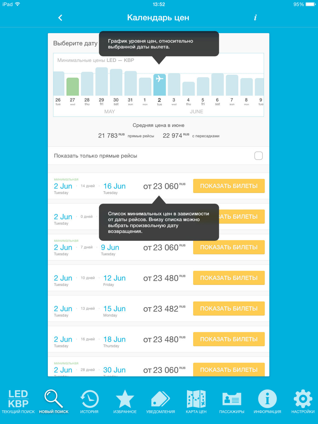 Приложение радует симпатичным дизайном и удобной навигацией. Из главного меню, расположенного в нижней части экрана, можно легко перейти в нужный раздел. Функция поиска впечатляет множеством фильтров, которые позволяют детально настроить список предложений по заданному маршруту. Результаты поиска можно отсортировать даже по «задействованным» аэропортам и способам оплаты билета! Очень интересно смотрится инструмент «Карта цен», который отображает все города, куда можно отправиться из выбранного места, а также минимальную стоимость полета.