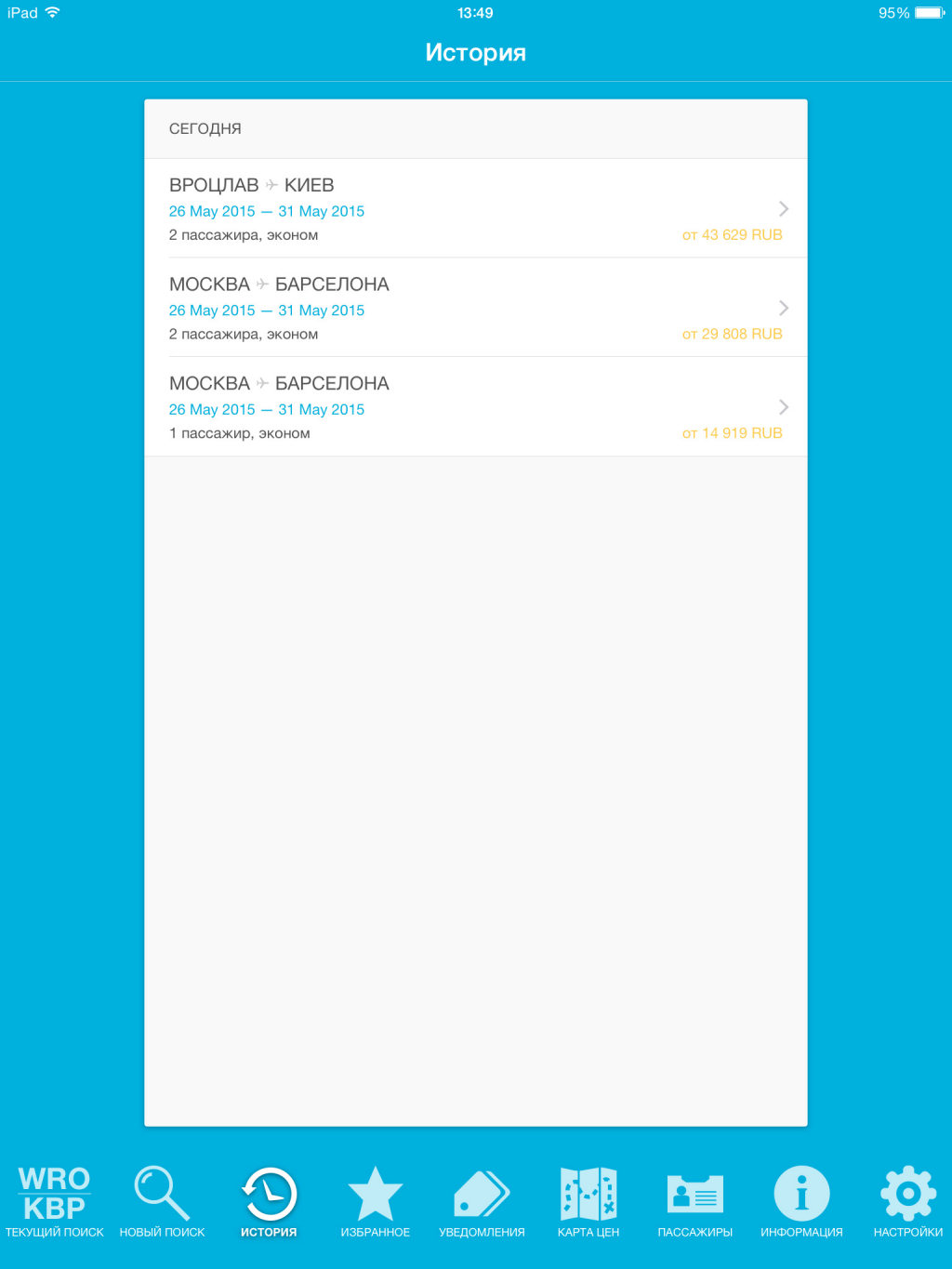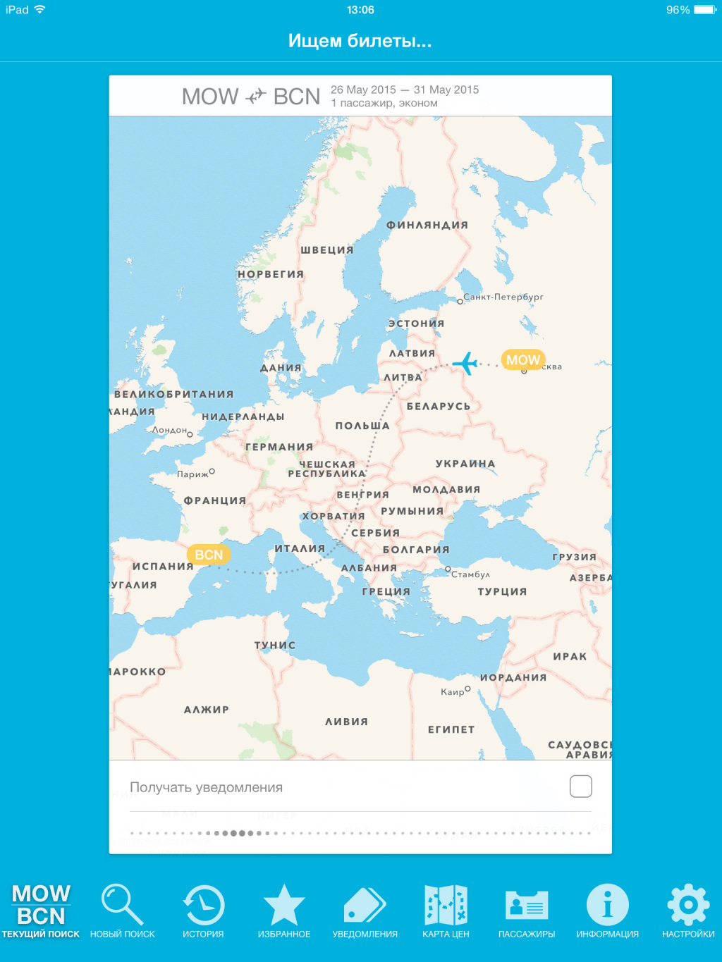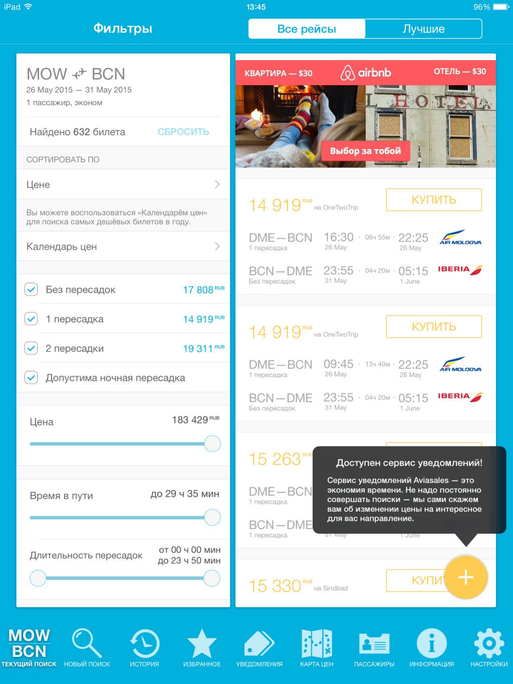 Стоит признать, что у программы практически нет минусов. Отметим только, что порой поиск занимает слишком много времени, а некоторые разделы не используют всю площадь экрана iPad, но идеально смотрятся на смартфонах. Да, и в мобильном сервисе пока не реализованы все возможности сайта Aviasales.ru, где помимо покупки авиабилетов можно забронировать гостиницу, взять напрокат автомобиль и приобрести страховку перед поездкой в любую страну мира.