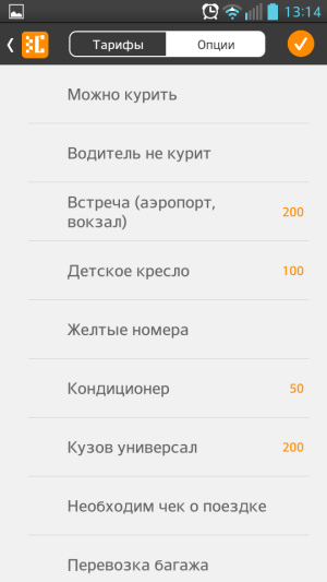 В мобильном приложении Сити-Мобил, пожалуй, самое большое количество вариантов для выбора дополнительных функций. На главном экране вы задаете в привычном уже режиме — откуда едете и куда (на карте или через ввод адреса, можно также мгновенно выбрать аэропорт или вокзал через быстрый список), время подачи машины, тариф и опции. Вот тут самое раздолье. Вы можете выбрать курящего или некурящего водителя, можно курить в машине или нет, встречу в аэропорту или на вокзале, наличие детского кресла, желтых номеров, кондиционера, оплату картой и еще несколько пунктов.