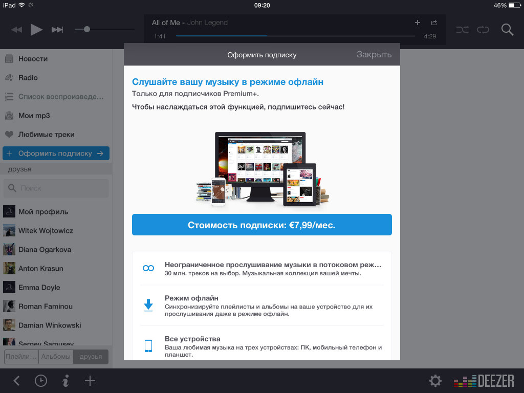Приложение Deezer можно бесплатно скачать в AppStore, но для полноценной работы сервиса (отсутствие рекламы, наилучшее качество музыки, возможность офлайн-прослушивания) требуется ежемесячная подписка за 199 рублей, а также устройство на базе iOS 7 или выше.