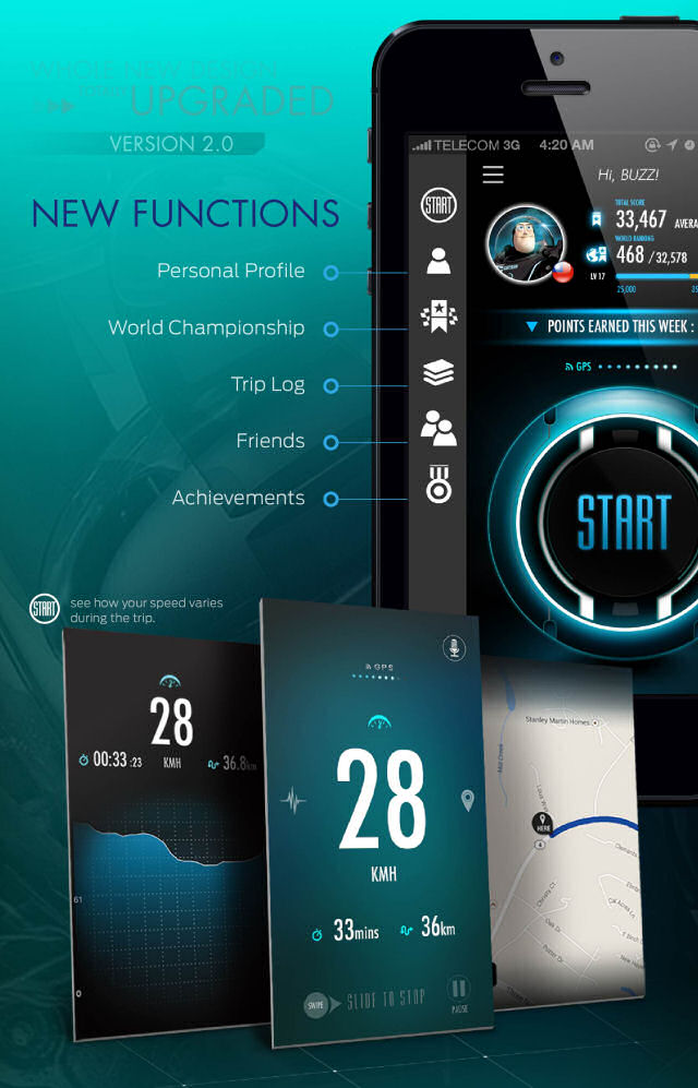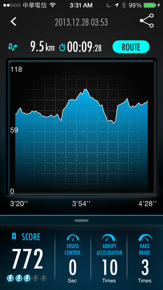 Вы просто нажимаете кнопку «Старт» перед поездкой, и приложение отслеживает вашу скорость на основании GPS данных и датчиков движения iPhone. Когда вы прибываете в конечную точку поездки, нажимаете «Стоп» и приложение автоматически анализирует информацию о ваших ускорениях, торможениях, потреблении горючего и пройденной дистанции.