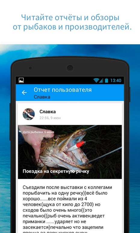 - смотреть, оценивать и комментировать самые интересные отчеты других рыбаков;