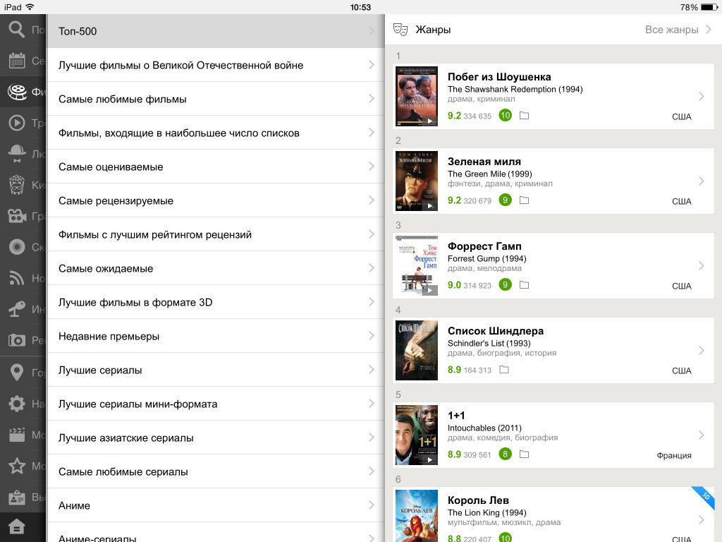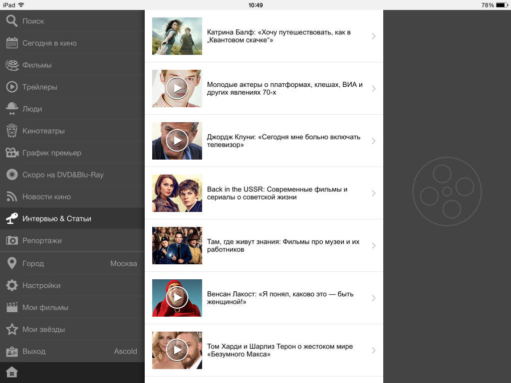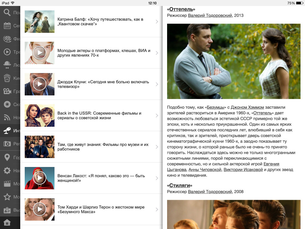 В приложении замечательно реализована навигация по страницам. Главное меню, расположенное в левой части экрана, частично закрывается новыми вкладками, но всегда остается доступным для вызова. Киноманы получают удобный доступ ко всем видеоматериалам, будь то трейлер к фильму, фрагмент из старой киноленты или интервью. Кроме того, на сервисе можно регулярно увидеть прямую трансляцию с премьеры нового фильма или репортаж с известного кинофестиваля.