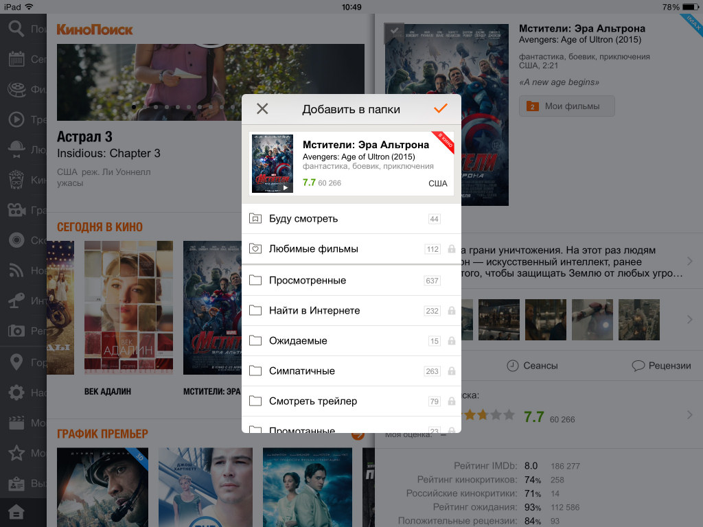 После регистрации пользователю открывается удобная функция – возможность добавления в закладки фильмов, актеров, режиссеров и других людей, которые своими «кинематографическими» деяниями наработали на отдельную страничку в огромной базе данных КиноПоиска. Добавлять в «Избранное» можно даже кинотеатры! Причем, закладки отображаются в виде папок, которые можно редактировать и создавать новые – в результате получаем очень удобный инструмент для управления каталогами. Давно хотели создать подборку любимых мультфильмов из своего детства? А как насчет коллекции фильмов, которые смотрели в кинотеатре? А у заядлых киноманов ведь наверняка есть даже любимые операторы и композиторы…