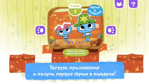 Интерфейс «Котиков» яркий и весёлый. Все серии лежат в закрытых волшебных коробках, можно достать оттуда нужный мультик и приступать к просмотру. Чтобы увидеть кадры серии, нажимаем на кошачьи следы.
