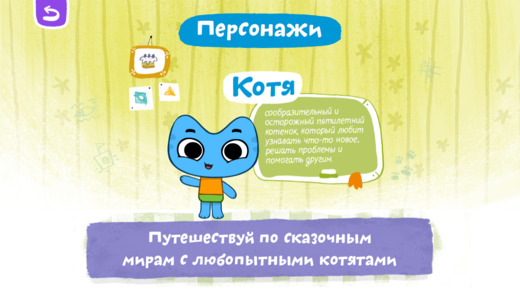 В приложении есть раздел описания главных героев: здесь Котя, Катя, Мама и Папа. Родители могут прочитать своим малышам интересные описания и истории про милых котят.