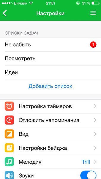 Управление списками с помощью «свайпов» (жестов) делает работу с приложением легким и динамичным и придает ощущение, что справиться со всеми своими делами так же просто. Новый элемент можно добавить движением сверху вниз. Горизонтальный свайп или нажатие вверху экрана до появления меню позволяет переключаться между списками. К жестам для управления отдельными задачами придется, правда, привыкнуть. Чтобы установить таймер, задачу надо потянуть слева направо. Но если при этом задержать палец на экране, появится возможность перенести элемент в другой список. Задачи удобно копировать в буфер обмена длинным нажатием. Жест справа налево служит для пометки «Выполнено», а с задержкой пальца – удаление. Будьте аккуратны, ведь отменить действие нельзя. Задачи можно менять местами в рамках списка с помощью иконки в верхнем правом углу, а нажатие по иконке будильника позволяет узнать, когда придет напоминание о следующей цели.