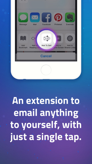 Незаменимое расширение для любого пользователя, который более менее активно работает с контентом на мобильном устройстве. Mail to Self делает очевидное – посылает все, что вам угодно на ваш собственный почтовый ящик. С Mail to Self не надо больше открывать стандартный почтовый клиент, вводить свой собственный адрес и придумывать тему — все делается автоматически и в один тап.