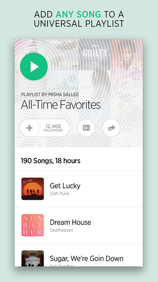 Музыкальный плеер, объединяющий множество других потоковых сервисов. С его помощью вы сможете создать плейлист, например, объединяющий Spotify, Rdio, Beats и YouTube.