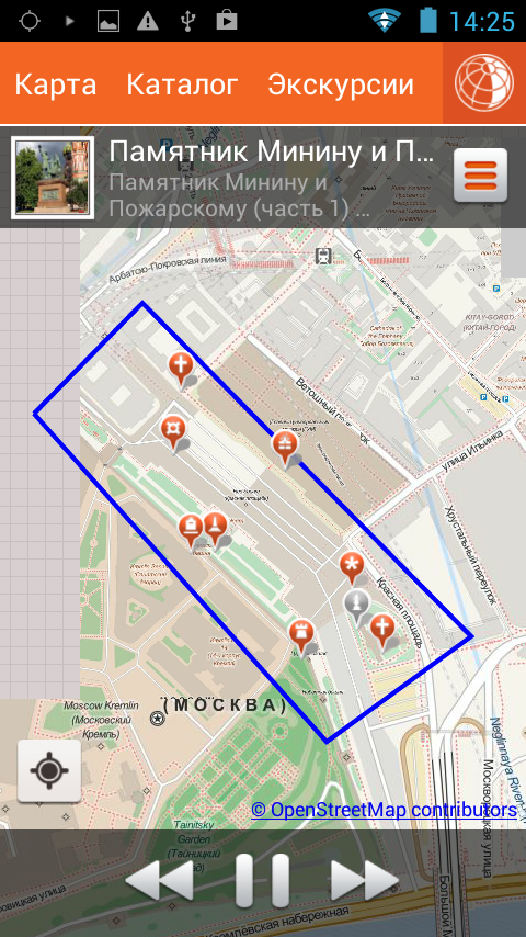 GPS-путеводитель «Вокруг Света» – аудиогид для самостоятельных экскурсий. Приложение предлагает маршруты экскурсий, показывает достопримечательности на карте, а при скачанной экскурсии работает с оффлайн-картой. «Вокруг света» содержит более 160 экскурсий, включая тематические, автомобильные и речные.
