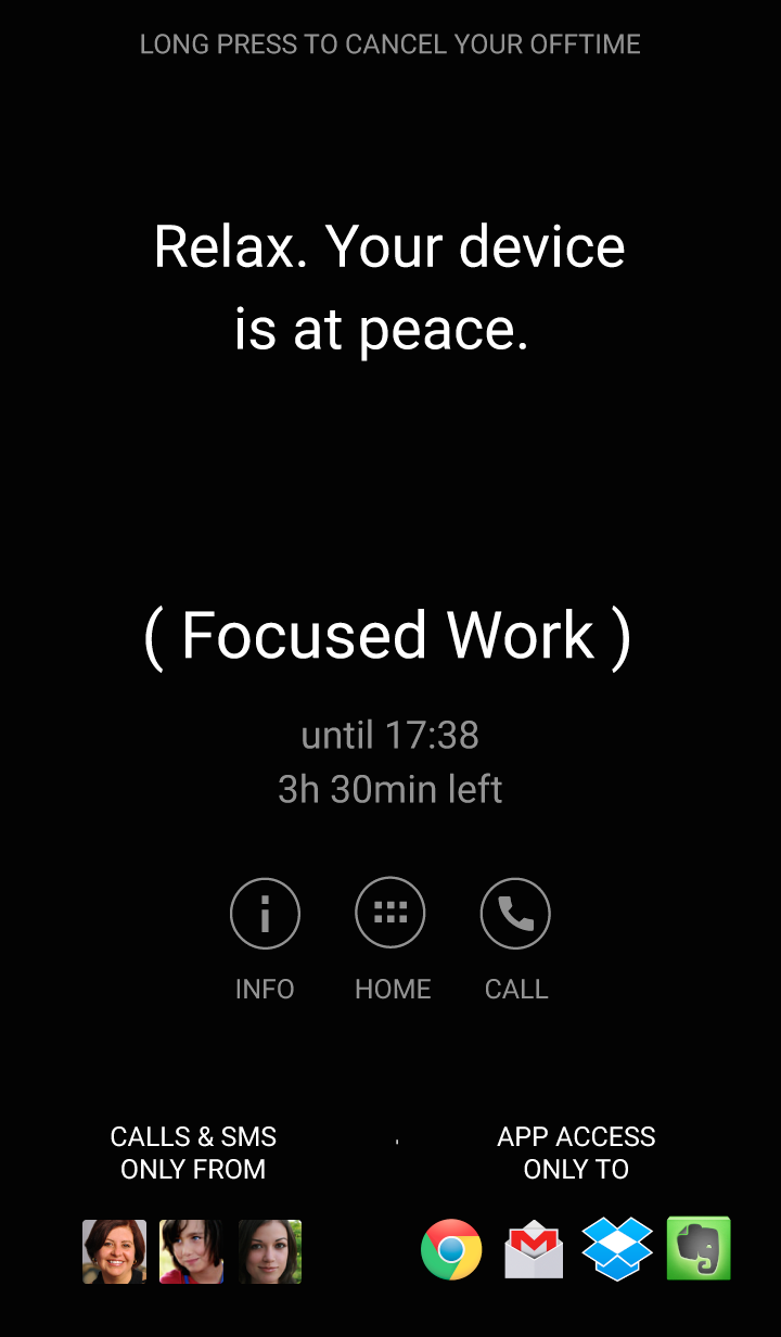 Мы нашли вдохновение в десктопных приложениях вроде Freedom, которые блокируют доступ в интернет для некоторых приложений и сервисов, и расширили эту концепцию в мобильной сфере. OFFTIME гарантирует, что не останется никакого источника отвлечения внимания: ни приложения, ни звонки, ни веб и ни ты сам не помешают вам. Кроме того, вы узнаете, на что тратите время при использовании мобильных устройств и что надо изменить, чтобы лучше фокусироваться.