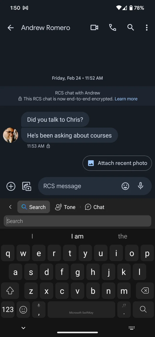 После установки и настройки бета-версии SwiftKey, всякий раз, когда вы будете заходить в область, где можно вводить текст, будет появляться SwiftKey, и вы заметите логотип Bing, который появится в верхней левой части прямо над клавиатурой. При нажатии на него появятся три различные опции: «Поиск», «Тон» и «Чат». Опция «Тон» предлагает четыре варианта тональности для текстов: профессиональный, социальный текст, повседневный и вежливый.