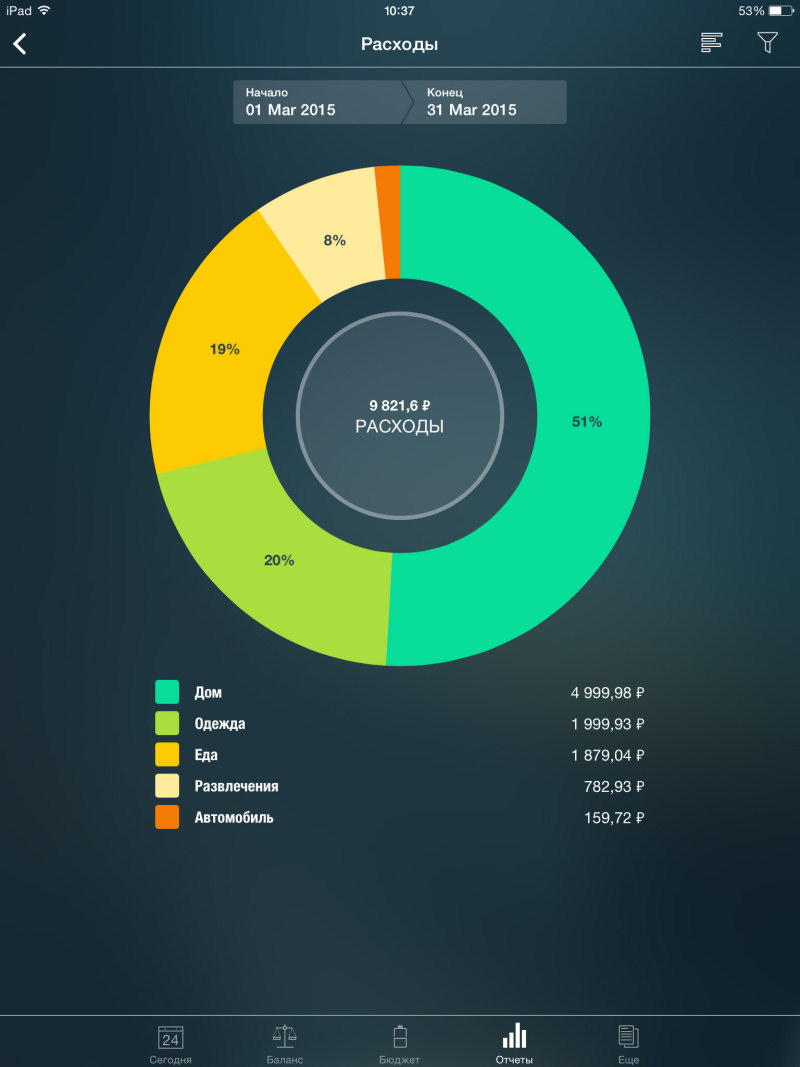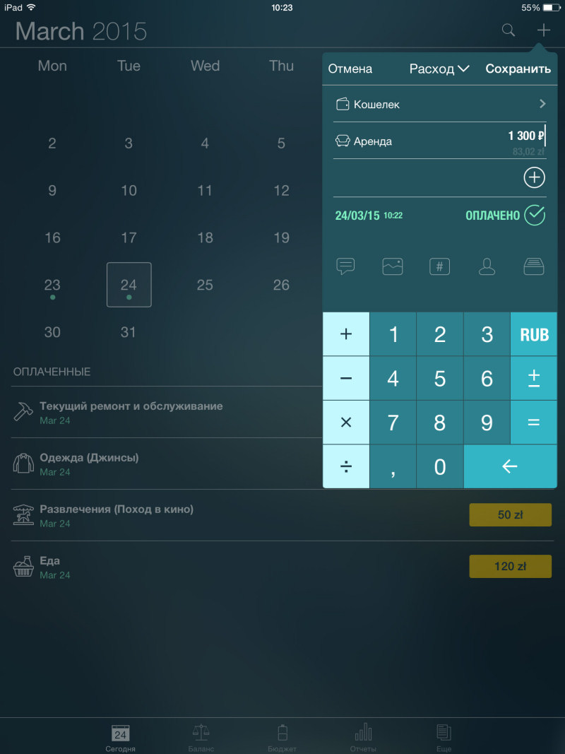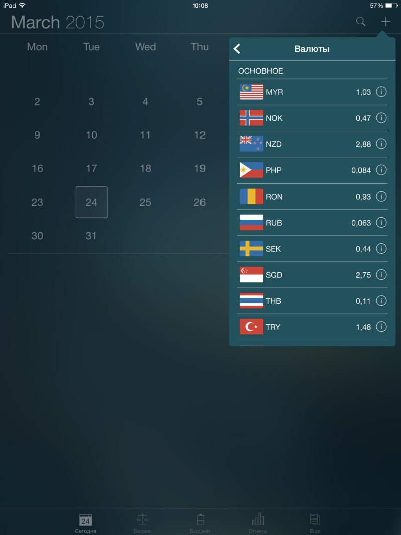 Программа радует своим внешним видом – стандартная тема оформления смотрится просто здорово. Пользователю доступно пять основных вкладок главного меню, расположенного в нижней части экрана. Первая кнопка открывает календарь с возможностью добавления расходов в одной из выбранных категорий – разумеется, список можно изменять. Забавно, что разработчик вынес траты в iTunes в отдельную категорию.