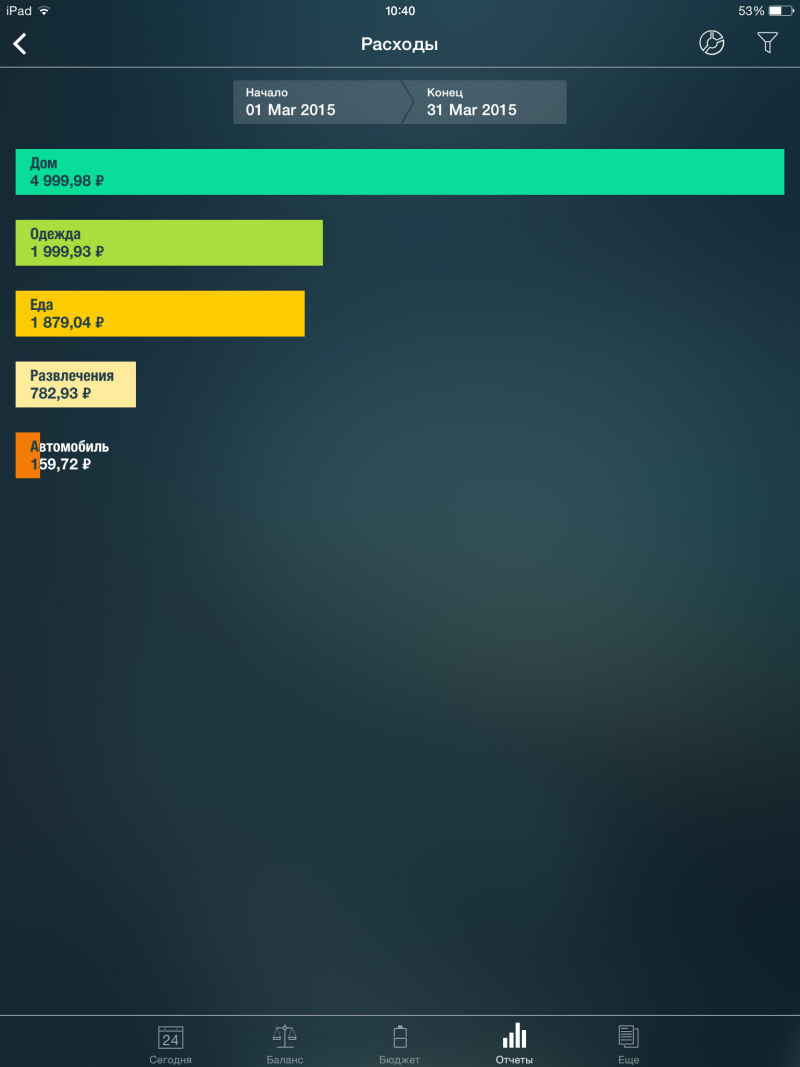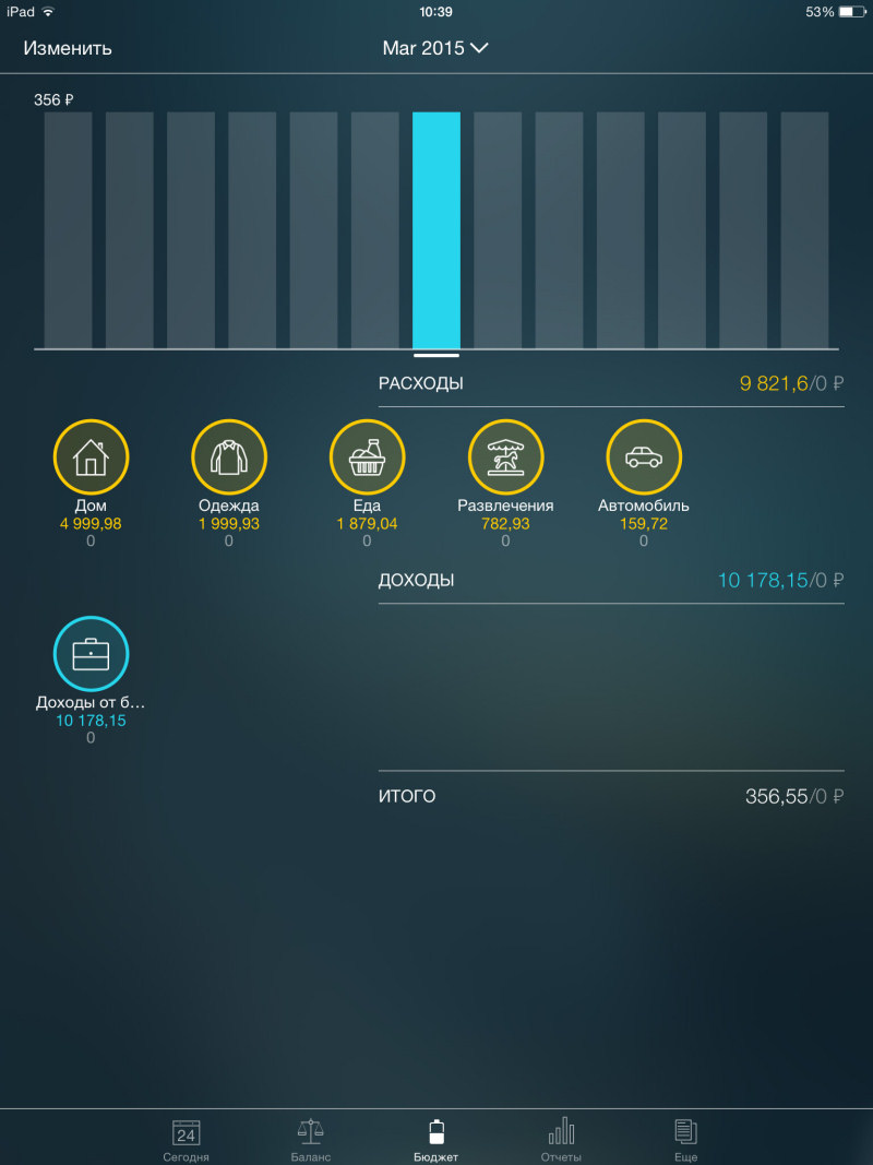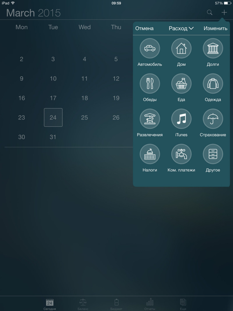 Программа радует своим внешним видом – стандартная тема оформления смотрится просто здорово. Пользователю доступно пять основных вкладок главного меню, расположенного в нижней части экрана. Первая кнопка открывает календарь с возможностью добавления расходов в одной из выбранных категорий – разумеется, список можно изменять. Забавно, что разработчик вынес траты в iTunes в отдельную категорию.