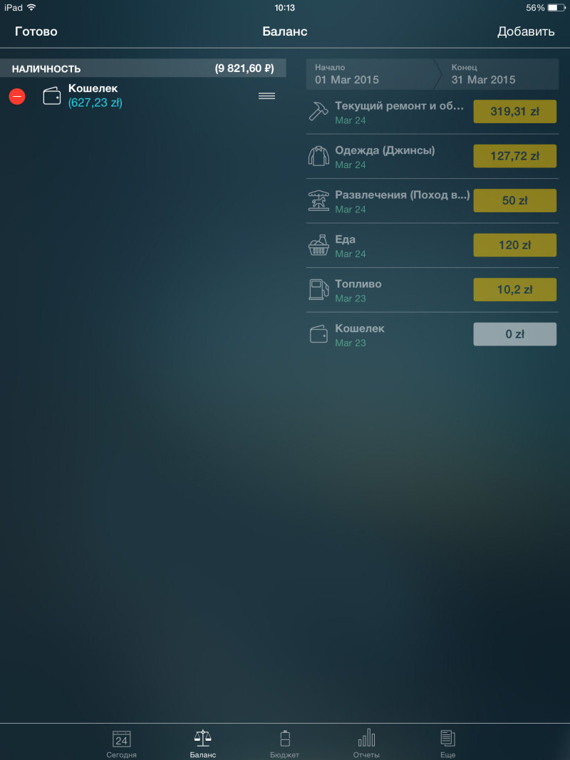 К каждой записи можно добавить комментарий, приложить фото чека, указать продавца (контрагента). Кстати, приложение может похвастаться конвертером валют, который обновляется ежедневно. Раздел «Баланс» показывает финансовую картину по всем счетам за выбранный период. Пользователь может добавить различные источники средств (наличные, платежная карта, Яндекс.Кошелек и другие) и выбрать актуальную валюту. Экран «Бюджет» позволяет сопоставить свои доходы и расходы, а в разделе «Отчеты» содержатся детальные графики по различным категориям, включая активы/обязательства и денежный поток.