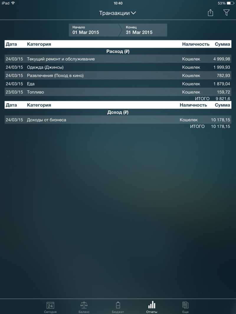 Наконец, последняя кнопка отвечает за настройки программы. Из полезных опций отметим возможность создания профайлов для нескольких пользователей, синхронизацию с другими «яблочными» устройствами через Bluetooth и даже iCloud, а также выбор валюты по умолчанию и темы оформления. Доступно также резервное копирование и последующее восстановления данных.