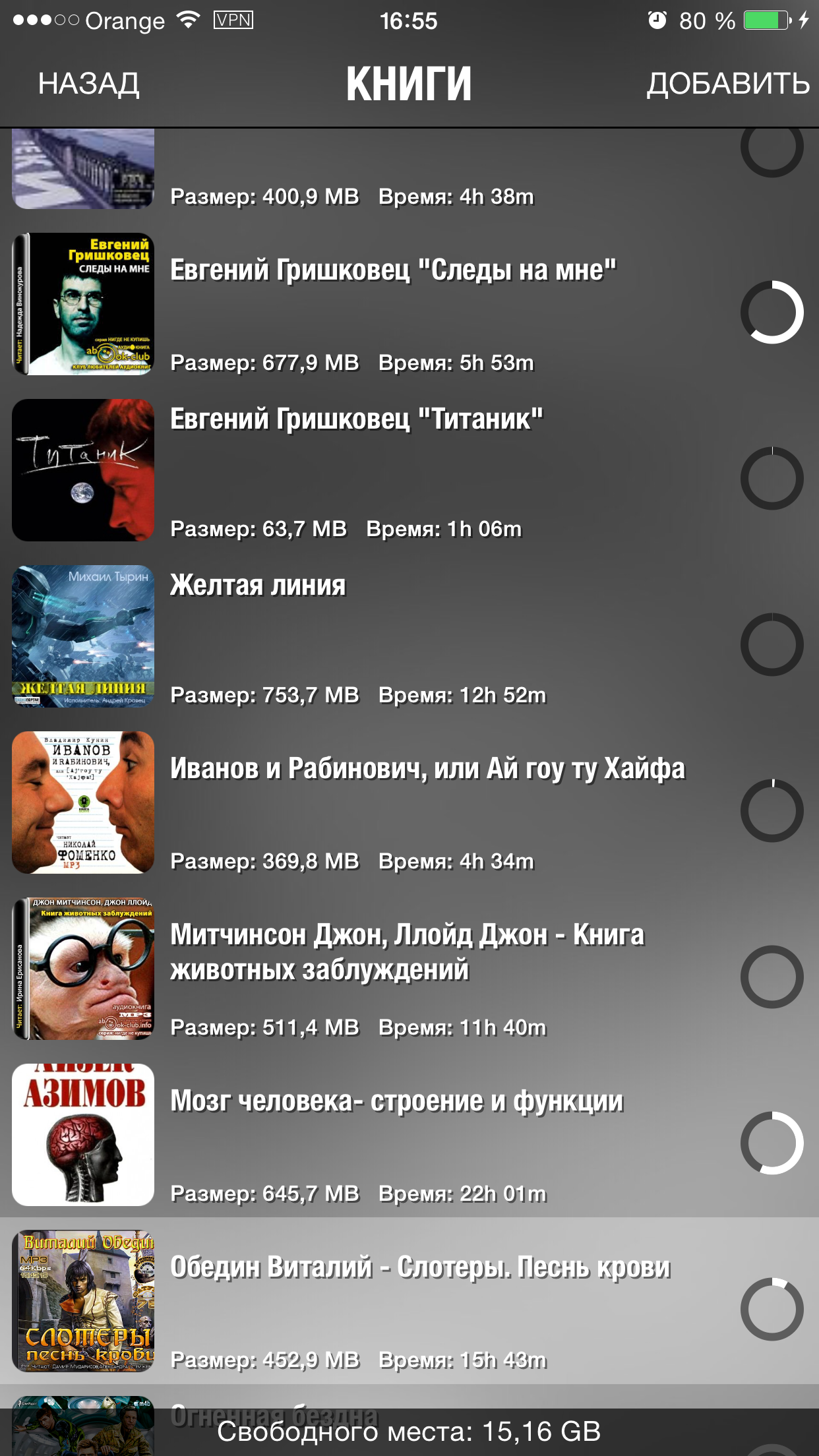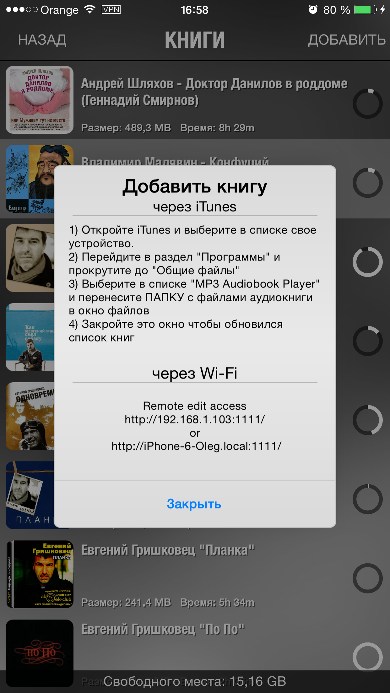 MP3 Audiobook Player – это удобное приложение для устройств iPhone, iPad и iPod Touch, которое позволяет прослушивать аудиокниги в наиболее популярных форматах MP3 и M4B (без DRM-защиты). Добавить книгу на мобильное устройство для прослушивания с помощью программы можно двумя способами: через главную «яблочную» программу iTunes или же передать файлы по Wi-Fi со своей библиотеки, находящейся на компьютере. В последнем случае следует зайти по ссылке сгенерированной приложением, и, нажав на кнопку «Добавить», выбрать файлы желаемой книги. Следует заметить, что при загрузке «по воздуху» книгу можно загружать как в виде отдельных файлов, так и целыми архивами без необходимости дополнительной конвертации.