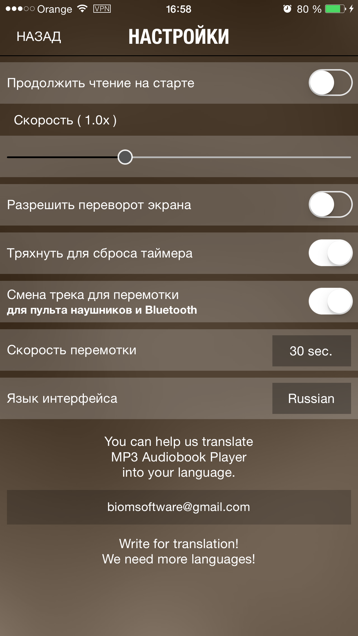 Приложение позволяет регулировать скорость воспроизведения аудиодорожек в диапазоне от 0,5 до 2 единиц, делать закладки. Очень интересная функция для любителей послушать книжку на ночь – таймер сна. Его можно установить на заданное время, через которое плеер сам остановит проигрывание аудиофайлов. Это может быть промежуток от пяти минут до часа, также есть возможность дать программе команду «отбой» после завершения текущей главы. Если же вам не спится, а таймер подходит к концу, то можно слегка хлопнуть по девайсу и отсчет таймера начнется сначала (эту фишку должны оценить все, кто щурил глаза в яркий экран посреди ночи :)).