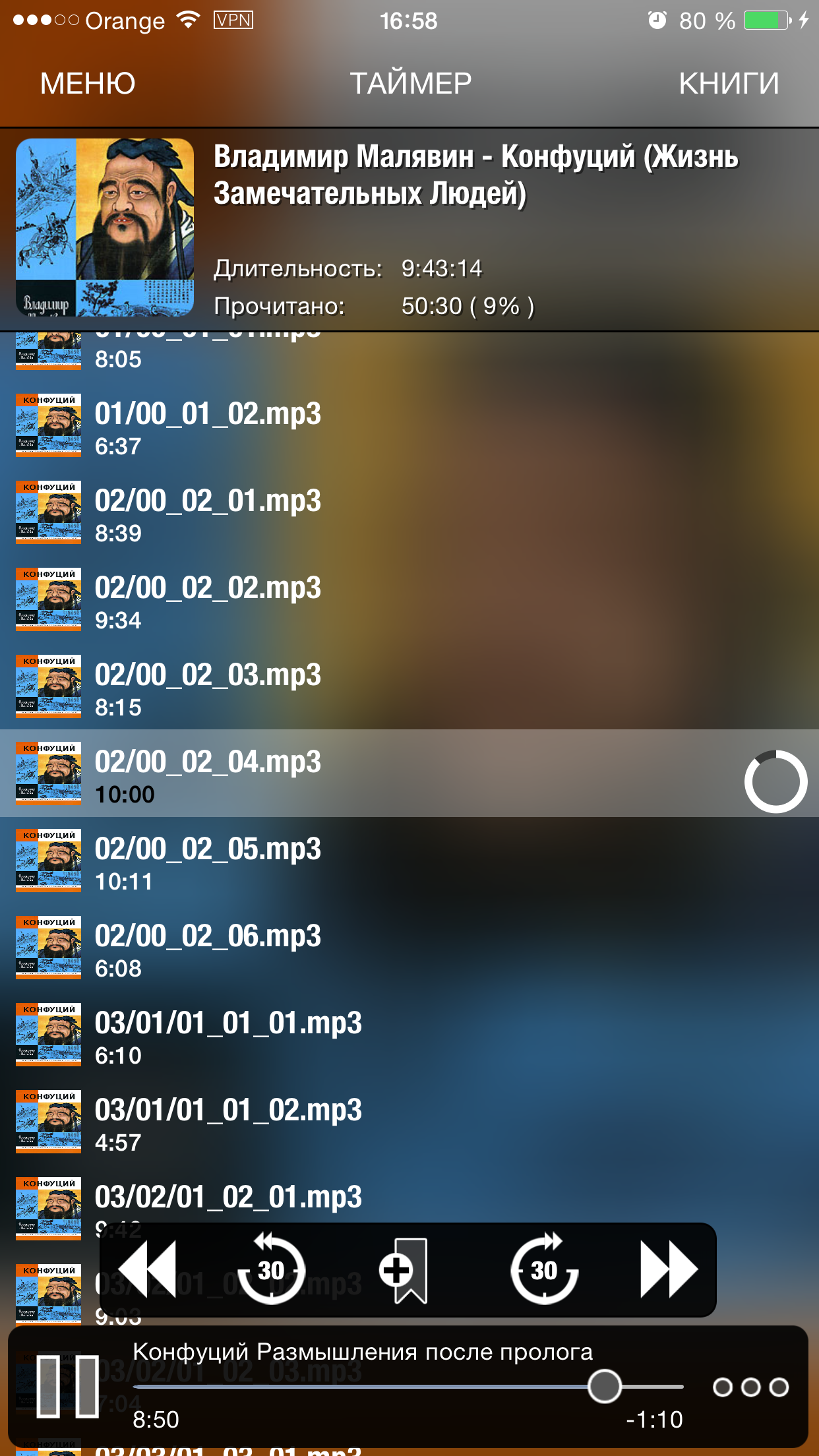 MP3 Audiobook Player автоматически подхватывает изображение для обложки, выбирая картинку из папки с аудиокнигой или используя графику, «вшитую» в аудиодорожку. Плеер имеет простой и приятный интерфейс, а удобство навигации и управления воспроизведением файлов, безусловно, стоит отнести к главным достоинствам программы. Очень приятное впечатление оставляет механизм навигации: путешествовать по главам книг можно также с помощью Центра Управления, Экрана Блокировки, а еще реализована поддержка управления с пульта наушников и по Bluetooth!