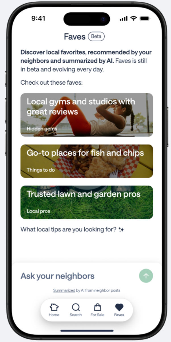 Что касается запуска Faves, Толия говорит, что рекомендации соседей более ценны, чем поиск в Google или ChatGPT, когда вы ищете местный ресторан или место, где можно провести время с семьей в выходные, поэтому Nextdoor запускает эту функцию. Новая функция Faves отображает тщательно подобранные списки рекомендаций, а также позволяет задавать конкретные вопросы, чтобы получить предложения.