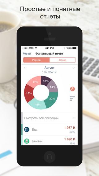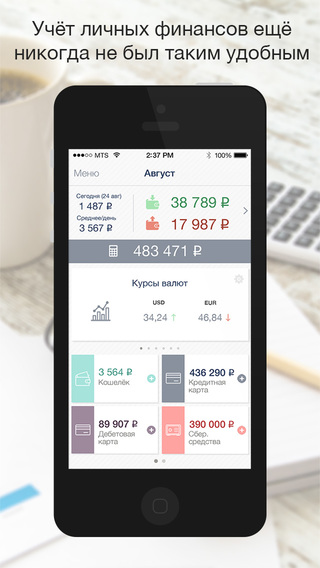 - максимально информативный главный экран, отображающий общий баланс вашего кошелька, состояние всех счетов, общие суммы дохода и расхода в текущем месяце, курсы валют и многое другое;